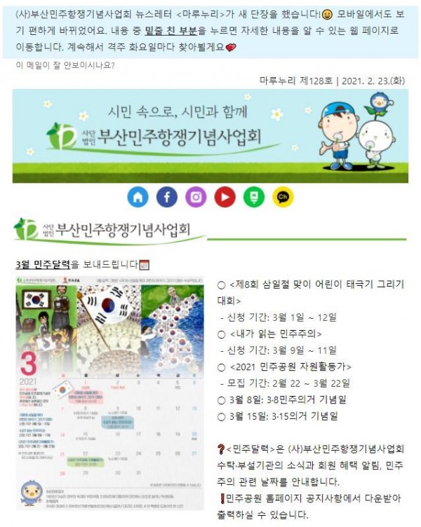 (사)부산민주항쟁기념사업회 뉴스레터 <마루누리>가 새 단장을 했습니다! 모바일에서도 보기 편하도록 만들어보았습니다. 3월 민주달력도 함께 보내드려요!제8회 삼일절 맞이 어린이 태극기 그리기 대회 소식과 2021 민주공원 자원활동가 모집 소식도 알려드립니다. …
