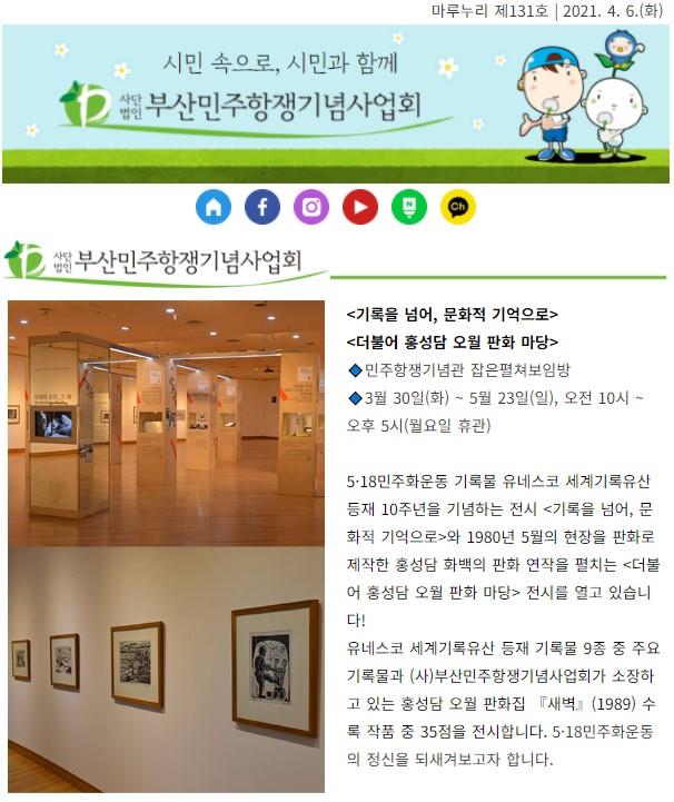 (사)부산민주항쟁기념사업회 뉴스레터 <마루누리> 131호를 보내드려요! 봄기운을 담아 4월 민주달력을 함께 전해드립니다! 유네스코 세계기록유산 등재 10주년 기념 <기록을 넘어, 문화적 기억으로>, <더불어 홍성담 오월 판화 마당&…