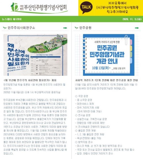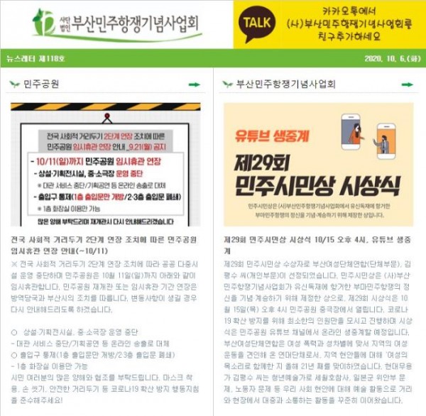 (2020.10.06)부산민주항쟁기념사업회 뉴스레터 제118호 - 민주공원 임시휴관..