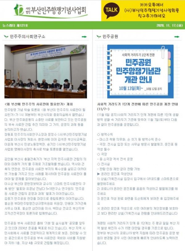 (2020.12.01)부산민주항쟁기념사업회 뉴스레터 제122호 - 민주공원 운영안내..