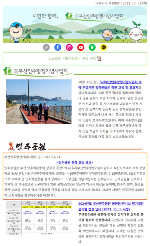 이번 추석 연휴 길다더니... 벌써 끝이라고요10월의 첫 뉴스레터, 196호 마루누리로 돌아왔습니다! 추석 전 부산지역 민주열사 유족들께 인사를 드리고 왔습니다. 모쪼록 건강하시길 바라며, 부마민주항쟁 44주년을 앞두고 제32회 민주시민상 시상식도 준비하고 있답니다.1…