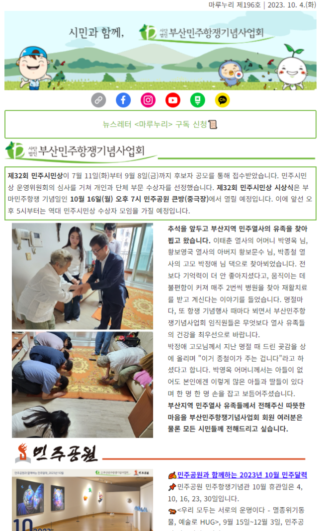 이번 추석 연휴 길다더니... 벌써 끝이라고요10월의 첫 뉴스레터, 196호 마루누리로 돌아왔습니다! 추석 전 부산지역 민주열사 유족들께 인사를 드리고 왔습니다. 모쪼록 건강하시길 바라며, 부마민주항쟁 44주년을 앞두고 제32회 민주시민상 시상식도 준비하고 있답니다.1…
