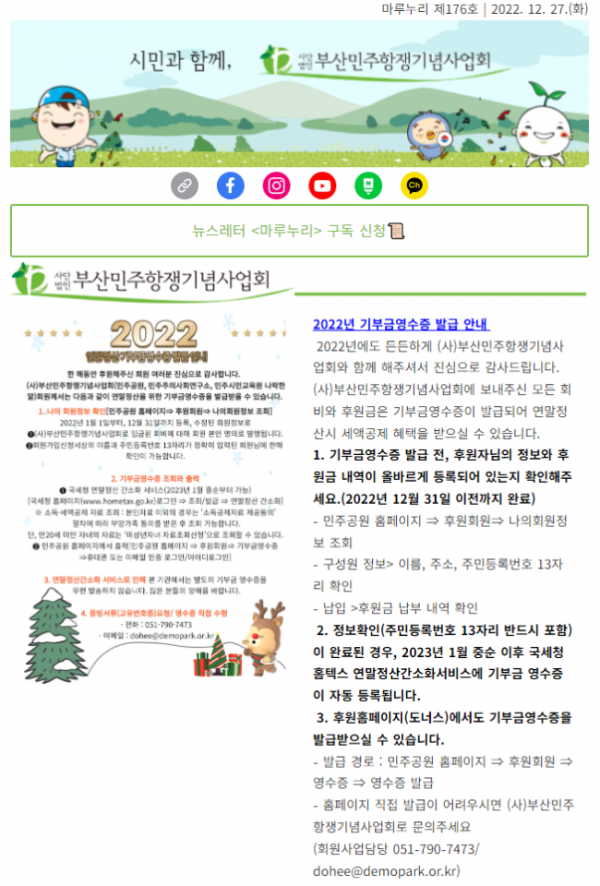 2022년에도 (사)부산민주항쟁기념사업회, 민주공원, 민주주의사회연구소, 민주시민교육원 나락한알과 함께해주셔서 감사합니다. 연말정산을 앞두고 기부금영수증 발급 관련 안내해드립니다. '인권'을 주제로 한 2022년 민주공원 소식지…