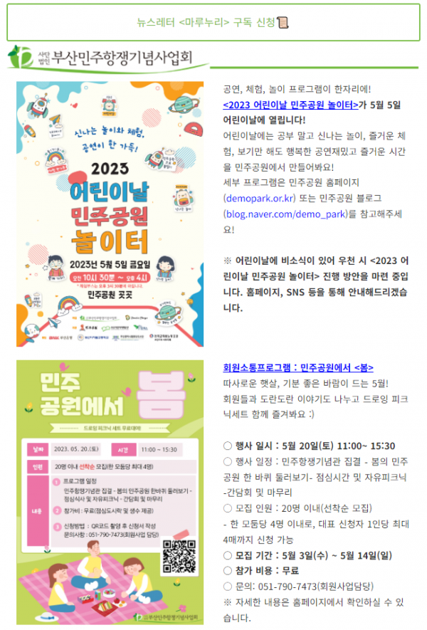 5월 5일 어린이날을 맞아 <2023 어린이날 민주공원 놀이터>가 민주공원에서 열립니다! 비소식이 있어 우천 시 어떻게 진행할지 논의 중이랍니다. 홈페이지와 SNS를 통해 빠르게 소식 전해드리겠습니다!소식지 봄호(통권 168) 발간 소식과 회원소통프로그램 :…