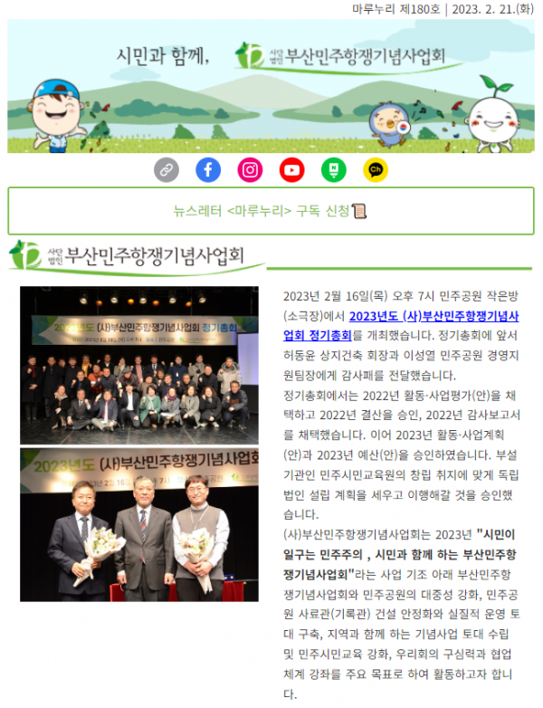 (사)부산민주항쟁기념사업회 2023년도 정기총회를 2월 16일(목) 오후 7시 민주공원 소극장에서 개최합니다. 회원 여러분의 많은 관심과 참여 부탁드립니다. 2월 회원 혜택 내용과 2월 민주달력도 전해드립니다. 2022년 연말정산에 필요한…