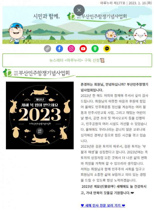 2023년 계묘년(癸卯年) 새해에도 늘 건강하시고, 가내 만복이 깃들길 기원합니다. (사)부산민주항쟁기념사업회, 민주공원, 민주주의사회연구소, 민주시민교육원 나락한알의 2022년 활동 영상과 연말정산 기부금영수증 발급 관련 안내해드립니다.민주공원 소식과 이 달의 민주주…