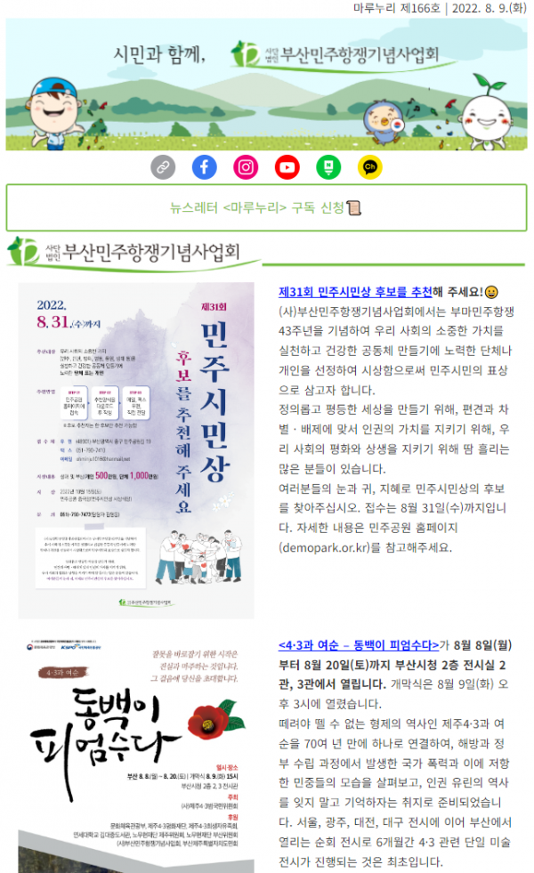 새 회원 가족들과 함께 거제도로 떠난 역사 모꼬지 소식부터 교실로 찾아가는 부산민주역사길 소식까지! 태풍이 지나가고 가을바람이 부는 날에 (사)부산민주항쟁기념사업회와 수탁·부설기관의 다채로운 소식을 전해드립니다. 격주로 발행되는 뉴스레터 …