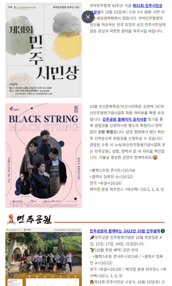 (사)부산민주항쟁기념사업회는 이태원 참사 희생자와 가족분들께 진심 어린 애도의 뜻을 표합니다. 부상자들의 빠른 쾌유를 기원하며 슬픔과 아픔을 잊지 않겠습니다.11월 민주달력에 실린 다양한 회원혜택과 행사 소식을 만나보세요. 11월 4일에는 오후 1시부터 5시까지 부산유…