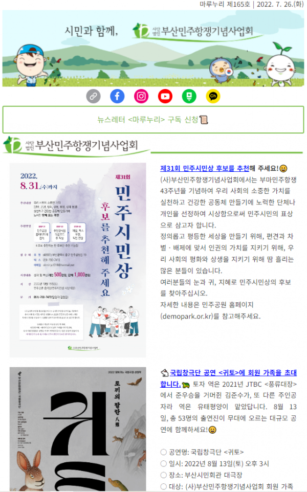 회원 가족 여러분을 국립창극단의 공연 <귀토>에 초대합니다! 8월 회원혜택으로 펼치는 초대에 많은 관심 가져주세요~부마민주항쟁 43주년을 맞아 여는 제31회 민주시민상 후보자 추천 공모와 부산 지역 촛불 사료 기억 수집 공모도 8월 31일까지 이어집니다. 여…