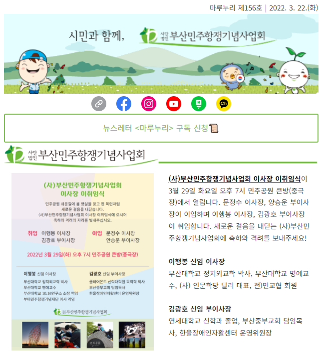 ※ 2022년 2월 22일(화) 발송하는 마루누리는 154호입니다. 제목 오기 양해 부탁드립니다.2022년 (사)부산민주항쟁기념사업회에서 이행봉 부산대 명예교수가 신임 이사장으로 선출되었습니다. 부이사장에는 김광호 중부교회 담당목사가 선출되었습니다. 2021년 한 해 …