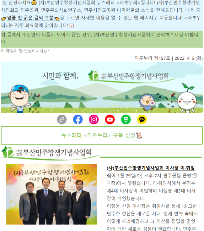 ※ 2022년 2월 22일(화) 발송하는 마루누리는 154호입니다. 제목 오기 양해 부탁드립니다.2022년 (사)부산민주항쟁기념사업회에서 이행봉 부산대 명예교수가 신임 이사장으로 선출되었습니다. 부이사장에는 김광호 중부교회 담당목사가 선출되었습니다. 2021년 한 해 …