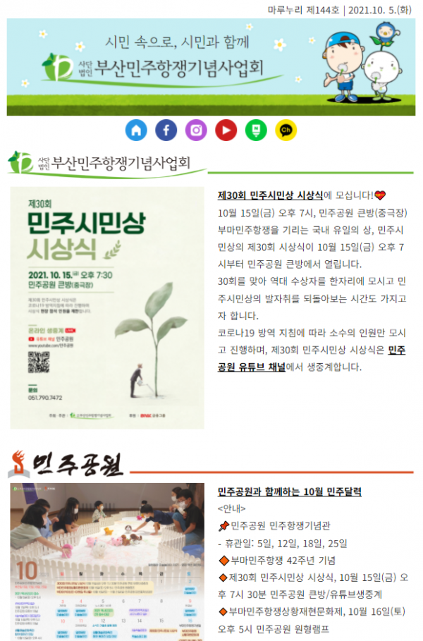 10월 첫 주에 보내드리는 뉴스레터 마루누리 144호입니다! 10월 민주달력과 함께 부마민주항쟁 제42주년을 맞이하여 열리는 제30회 민주시민상 시상식, 기념문화제와 기념전시 등 다양한 행사 소식 전해드립니다. 직원들의 '데모크라시 걸즈' 데뷔도 관심 가져 주세요부산민…