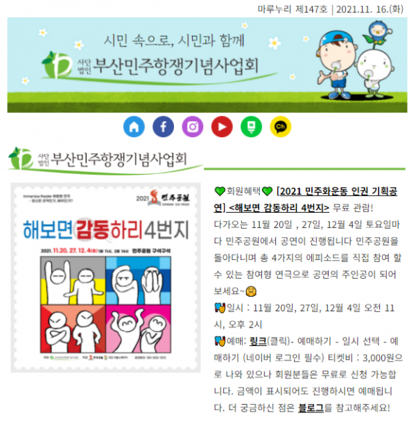 회원혜택 있습니다~ 민주공원에서 펼치는 [2021 민주화운동 인권 기획공연] <해보면 감동하리 4번지>에 회원 여러분을 무료로 초청합니다! 자세한 내용은 뉴스레터에서 확인해주세요.부마민주항쟁 42주년을 기념하는 부마아카이브 전시 <이웃집 투사…