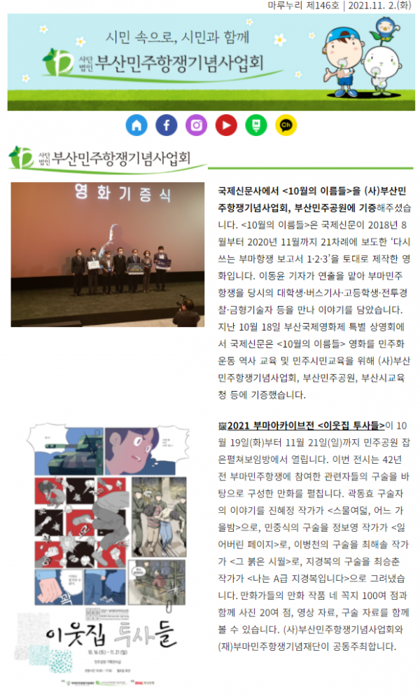 11월 민주달력을 담아 마루누리 146호를 보내드립니다. 부마민주항쟁 42주년을 기념하는 부마아카이브 전시 <이웃집 투사들>은 11월 21일(일)까지 민주공원 잡은펼쳐보임방(기획전시실)에서 열립니다. 소식지 『민주공원』 가을호(통권 162)도 발행했습니다.&…