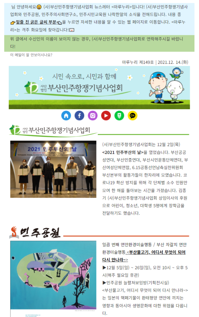 부산민주항쟁기념사업회의 다양한 활동과 수탁·부설기관의 소식을 만나보세요. 격주로 발행되는 뉴스레터 <마루누리>는 민주공원 홈페이지 뉴스레터 구독하기 신청 또는 아래 링크를 통해 메일로 받아보실 수 있습니다.