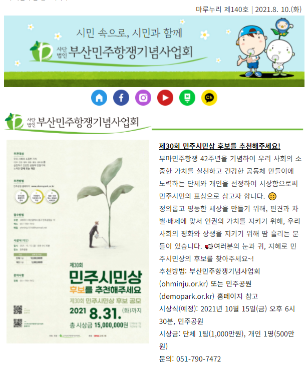 격주 화요일마다 오던 뉴스레터가 안 와서 많이 놀랐죠 많은 소식 알차게 보내드리려 하다 화요일이 지나 저희도 놀랐어요... 그래도 감사한 마음을 담아 보내는 <마루누리> 136호 받아주실거죠<6월민주항쟁 34주년 부산기념식·시민영상제> 개최 소식과…