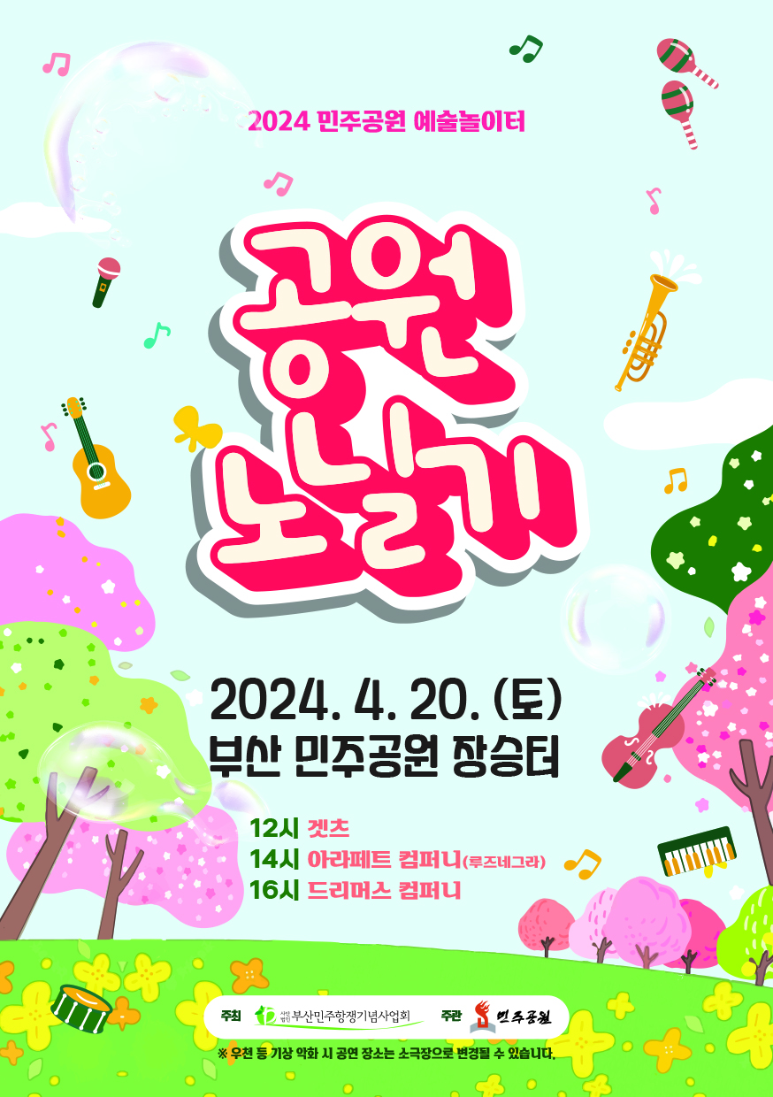 부산민주공원 장승터에서 겹벚꽃과 음악을 함께 즐길 수 있는 '공원 노닐기' 공연이 진행됩니다 : )