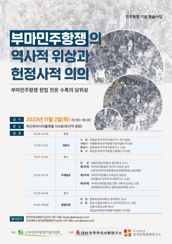 부마민주항쟁 44주년을 맞아 민주항쟁 기념 학술심포지엄 <부마민주항쟁의 역사적 위상과 헌정사적 의의 -부마민주항쟁 헌법 전문 수록의 당위성>을 11월 2일(목) 오후 3시부터 6시까지 부산유라시아플랫폼 104호에서 개최합니다.