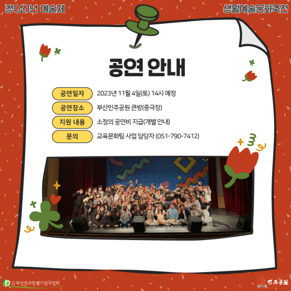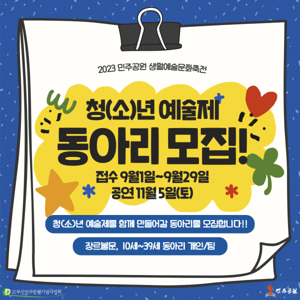 2023 민주공원 생활예술문화축전 참여 동아리(개인/단체) 모집(~9/29)