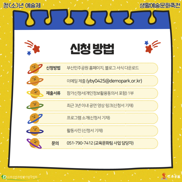 부산민주공원은 연간 30여만 명의 부산 시민들이 찾는 민주주의 역사의 산 교육장이자 시민들이 함께 할 수 있는 각종 공연과 행사가 이루어지는 복합문화공간입니다. 2023년 민주공원에서 “생활예술문화축전”을 함께 만들어갈 청소년, 청년 동아리를 모집하고 있습니다.