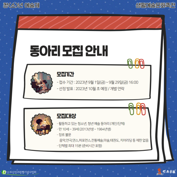 동아리 활동을 하고 있는 청소년, 청년 생활예술동아리 여러분의 많은 관심과 참여 부탁드립니다.