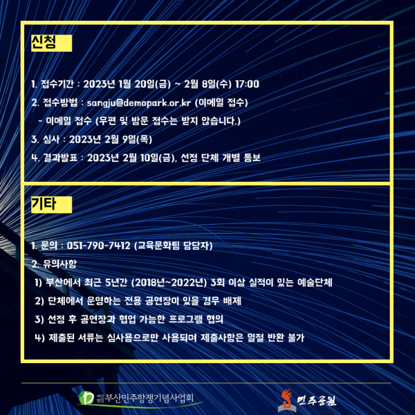 - 위의 공모는 부산민주공원과 예술단체 사이의 매칭(협약)을 위해 진행됩니다.