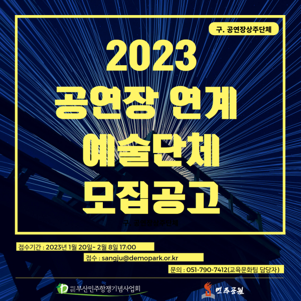 - 부산민주공원에서 공연장의 특성을 살려 2023년 공연장 연계 예술단체 육성지원 사업(구. 공연장상주단체육성지원)을 진행하고자 하는