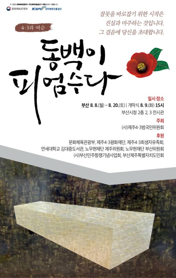 <4·3과 여순 - 동백이 피엄수다>가 8월 8일(월)부터 8월 20일(토)까지 부산시청 2층 전시실 2관, 3관에서 열립니다. 개막식은 8월 9일(화) 오후 3시입니다.