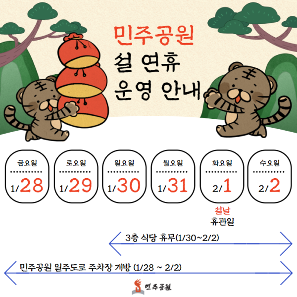 설 연휴에도 민주공원과 함께하세요! 설날 당일을 제외한 연휴 모두 개관합니다. 시민 여러분의 편의를 위해 민주공원 일주도로 주차장도 1월 28일부터 2월 2일까지 24시간 개방합니다. 1월 30일부터 2월 2일까지는 3층 식당이 영업하지 않으니 참고해주세요!