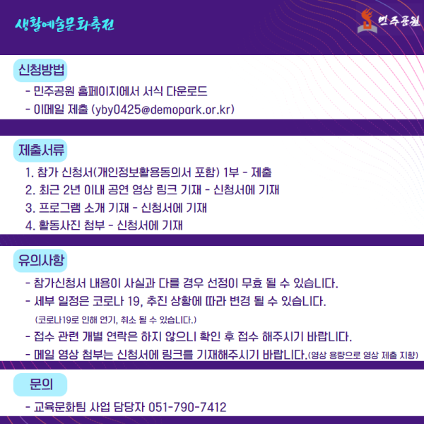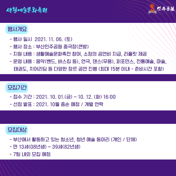2021 민주공원 생활예술문화축전 참여 동아리(개인/단체) 모집