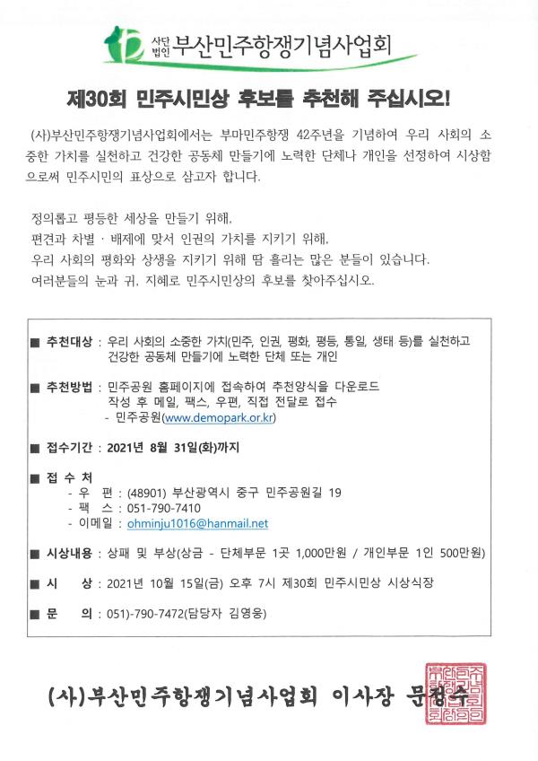 [안내] 제30회 민주시민상 후보를 추천해 주십시오!