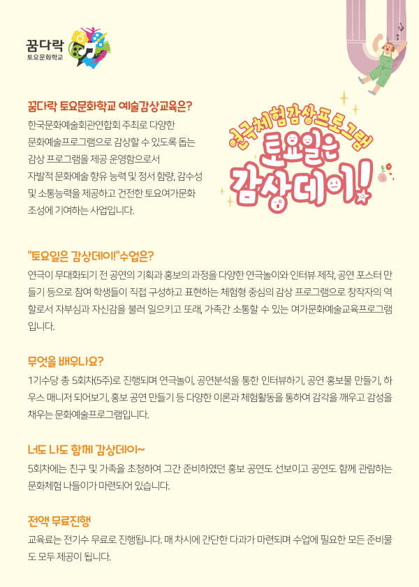 (일정 변경, 재공지)2021년 꿈다락 토요문화학교 예술감상교육 연극체험 감상프로그램 토요일은 감상데이!