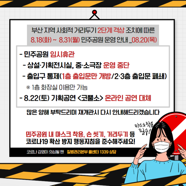 <8.20(목) 수정 공지> 부산 지역 사회적 거리두기 2단계 격상 조치에 따른 8.18(화) ~ 8.31(월) 민주공원 운영 안내