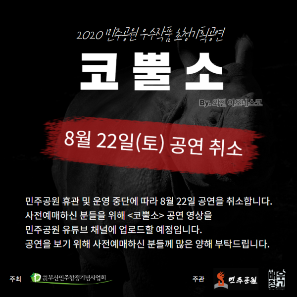 부산 지역 사회적 거리두기 2단계 격상 조치에 따른 민주공원 임시휴관 및 운영 중단으로 8월 22일(토) 오후 4시 공연 예정이던 민주인권 기획공연 <코뿔소> 공연을 취소합니다.