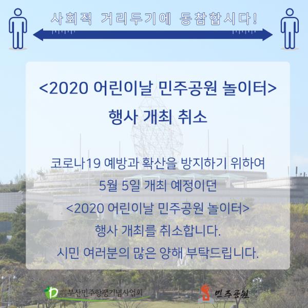 코로나19 예방과 지역사회 확산 방지를 위해 5월 5일 개최 예정이던 <2020 어린이날 민주공원 놀이터> 행사 개최를 취소합니다.