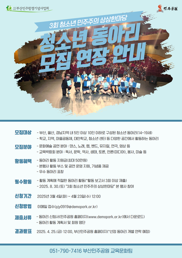 - 결과 발표 : 2025년 4월 25일(금) 12:00 민주공원 홈페이지 발표, 선정 동아리 개별 연락