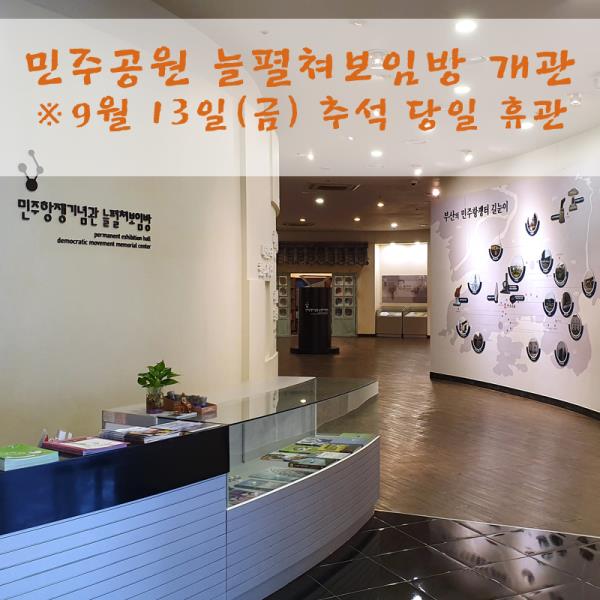 - 민주공원 늘펼쳐보임방(상설전시실) 개관 (※추석 당일만 휴관)