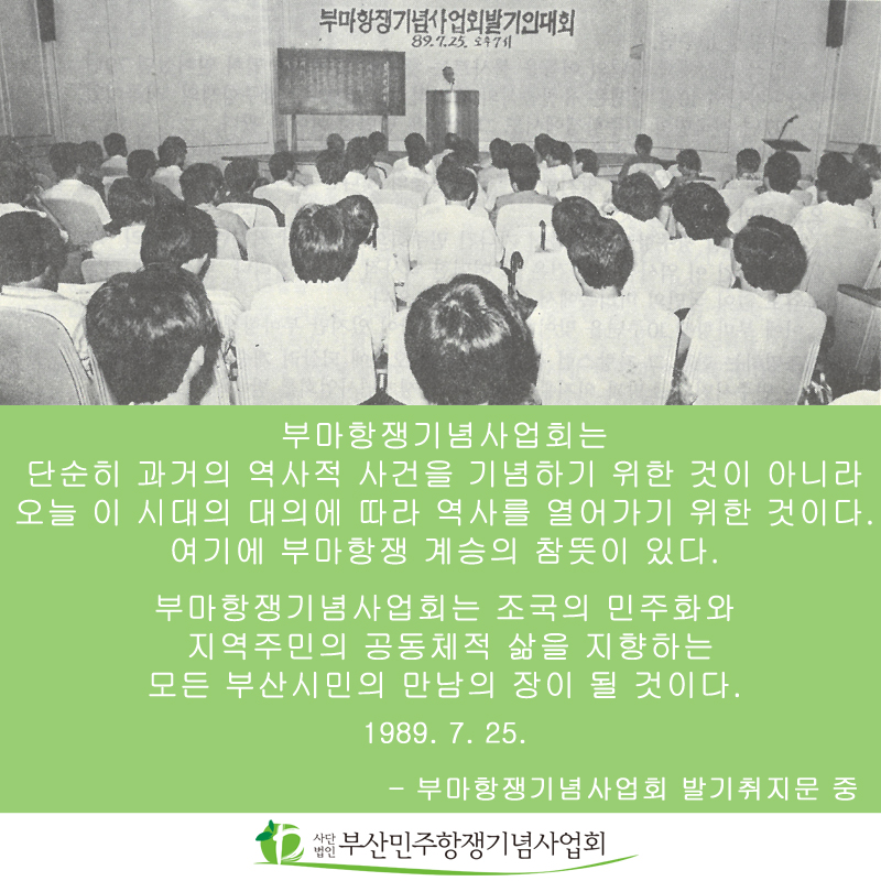1989년 7월 25일 부마항쟁기념사업회로 모여 지금까지 4·19혁명과 부마민주항쟁, 5·18민중항쟁, 6월민주항쟁, 촛불항쟁으로 이어져온 민주화운동을 평가·정리하고 기념·계승하고 있습니다.