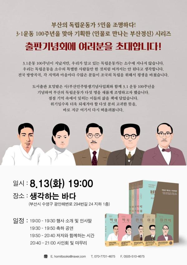 <부산경찰서 폭파의거 박재혁-적의 심장에 폭탄을 던져라>(안덕자 저), <조선의용대 부녀복무단장 박차정-민족과 여성의 진정한 자유를 꿈꾸다>(박미경), <백산상회 안희제-독립운동 비밀자금 주식회사>(양경화 저), <민족혁명 이론과 실천 이종률-민족의 역사를 책임져야 한다>(김정애 저), <해방, 그리고 통일을 위하여 최천택-협박과 고문에도 굴하지 않는 의지>(현정란 저) 총 5권입니다. 출판기념회는 8월 13일 오후 7시 생각하는 바다에서 열립니다.