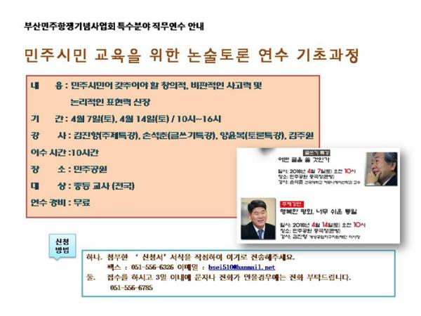 (사)부산민주항쟁기념사업회에서는 부산교육연수원 특수분야 연수기관 인정 ‘2018년 특수분야 직무연수’(부산교육연수원-2018-030호)를 다음과 같이 실시하오니 선생님들의 많은 참여바랍니다.