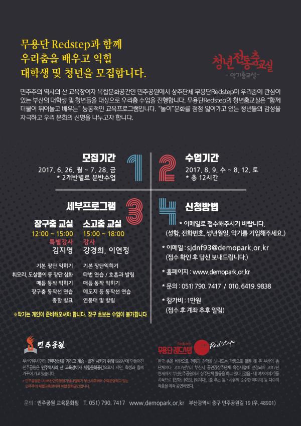민주주의 역사의 산 교육장이자 복합문화공간인 민주공원에서 상주단체 무용단Redstep이 우리춤에 관심이 있는 부산의 대학생 및 청년들을 대상으로 우리춤 수업을 진행합니다. 무용단Redstep의 청년춤교실은 “함께 더불어 뛰어놀고 배우는” 능동적인 교육프로그램입니다. “놀이”문화를 점점 잃어가고 있는 청년들의 감성을 자극하고 우리 문화의 신명을 나누고자 합니다.