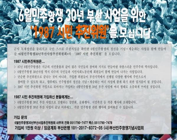 군사독재정권을 물리치고 국민 스스로 주권자임을 확인한 6월민주항쟁의 정신을 기념,계승하는 사업을 함께 만들어 갈 <6월민주항쟁30년부산사업추진위원회>의 ‘1987 시민 추진위원’을 모십니다.