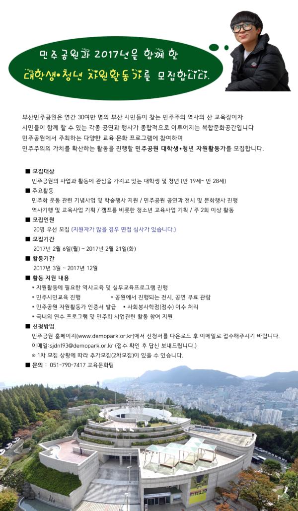 부산민주공원은 연간 30여만 명의 부산 시민들이 찾는 민주주의 역사의 산 교육장이자 시민들이 함께 할 수 있는 각종 공연과 행사가 종합적으로 이루어지는 복합문화공간입니다. 민주공원에서 주최하는 다양한 교육·문화 프로그램에 참여하며 민주주의의 가치를 확산하는 활동을 진행할 민주공원 자원활동가를 모집합니다.
