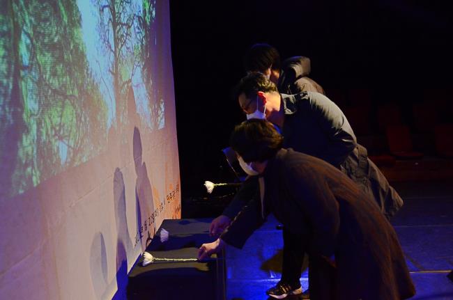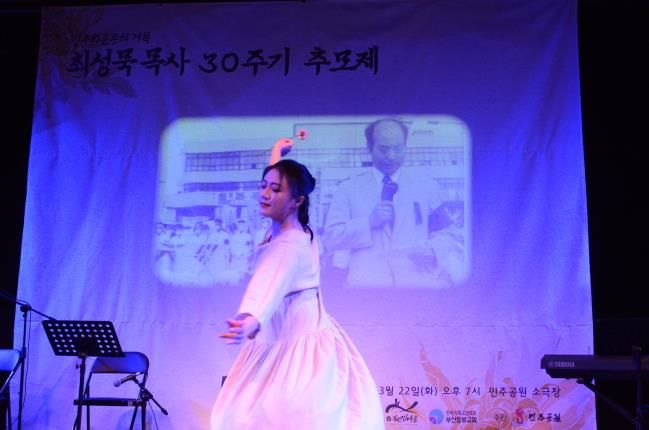 이청산 한국민예총 이사장은 추모시를 낭송했으며 최성묵 목사를 이어 부산중부교회를 이끌고 있는 김광호 목사(부산민주항쟁기념사업회 부이사장)는 추모사와 함께 최성묵 목사의 삶과 얼을 짧게 강연하였습니다. 민주공원 자원활동가들이 찾아본 최성묵 목사의 발자취를 영상으로 보고 국악그룹 뜨락, 소리꾼 김다솜, 춤꾼 이연정의 추모 공연이 펼쳐졌습니다.
