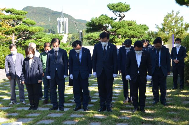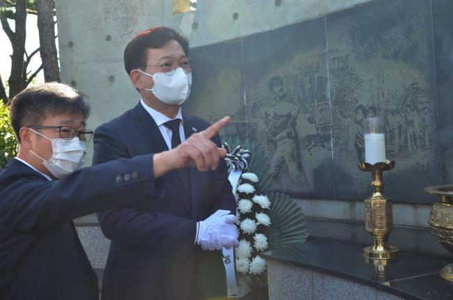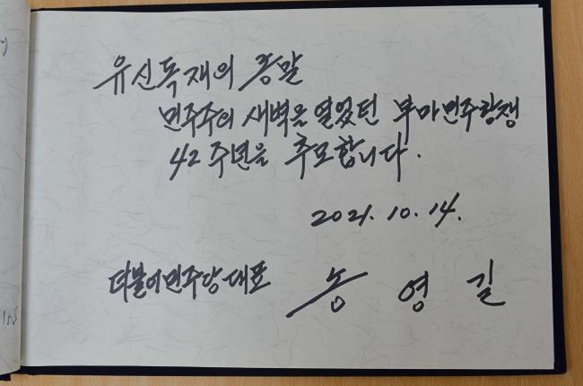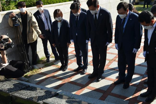 송영길 더불어민주당 대표가 10월 14일 오전 민주공원을 찾아 넋기림마당에서 호국영령과 민주열사에 참배했습니다. 송영길 대표는 참배 후 넋기림마당 추모조형물인 <민주의 이름>을 살펴보고, 이한열, 황보영국, 이태춘 열사의 기림비 앞에서도 참배했습니다. 참배 후 "유신독재의 종말 민주주의 새벽을 열었던 부마민주항쟁 42주년을 추모합니다."라는 방명록을 남겼습니다.