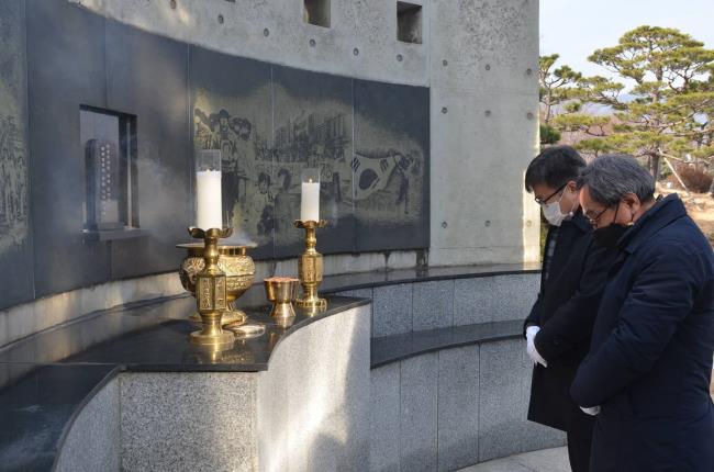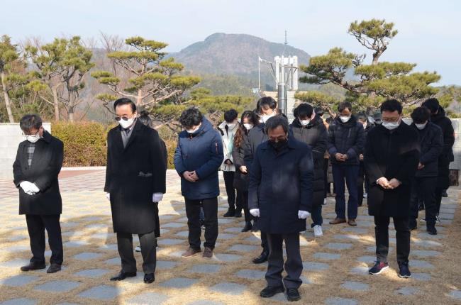 (사)부산민주항쟁기념사업회 수탁, 부설 기관의 임·직원과 겨울 동안 함께하는 근로장학생은 민주공원 넋기림마당에서 참배하며 2021년 업무를 시작했습니다. '시민 속으로, 시민과 함께'라는 기치 아래 한국 민주주의 발전에 기여하는 한 해가 되도록 노력할 것을 다짐했습니다.