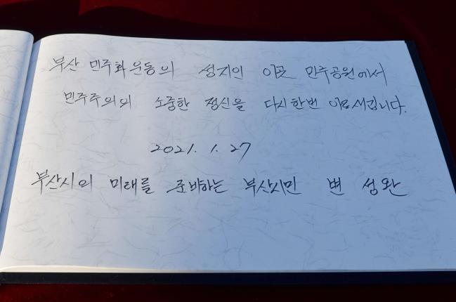 변성완 전 부산광역시장 권한대행이 1월 27일 민주공원을 찾아 넋기림마당에서 참배를 하고 김종기 민주공원 관장과 이야기를 나눴습니다. 변성완 전 권한대행은 참배 후 "부산 민주화운동의 성지인 이곳 민주공원에서 민주주의의 소중한 정신을 다시 한 번 아로새깁니다"라는 글을 남겼습니다.