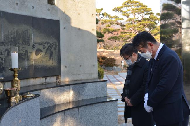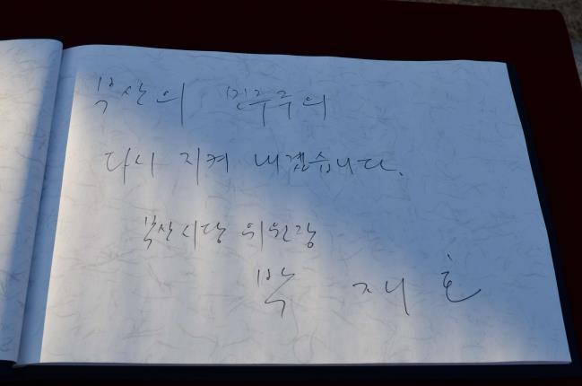 1월 4일 아침 박재호 더불어민주당 부산시당 위원장이 민주공원을 찾아 넋기림마당에서 더불어민주당 부산시당을 대표하여 민주열사에게 참배했습니다. 참배 후 방명록에 "부산의 민주주의 다시 지켜 내겠습니다"라는 글을 남겼습니다.