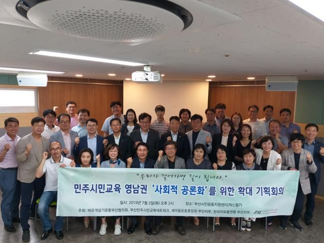 (사)부산민주항쟁기념사업회와 부설기관 민주주의사회연구소, 민주시민교육원 나락한알 등 50여 개 부산지역 시민사회 단체가 함께하는 부산민주시민교육네트워크(부산민시넷)가 연 <민주시민교육 영남권 '사회적 공론화'를 위한 확대 기획회의>(7월 2일, 부산시민운동지원센터)가 앞으로의 기대 속에 마무리되었습니다. 바르게살기운동협의회, 부산광역시 새마을운동, 한국자유총연맹 부산지부와 함께 모둠별로 민주시민교육의 주제를 정하고 프로그램을 기획하는 시간을 가졌습니다. 책읽기, 통일, 환경 등 다양한 주제를 이야기했습니다.