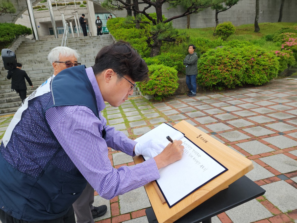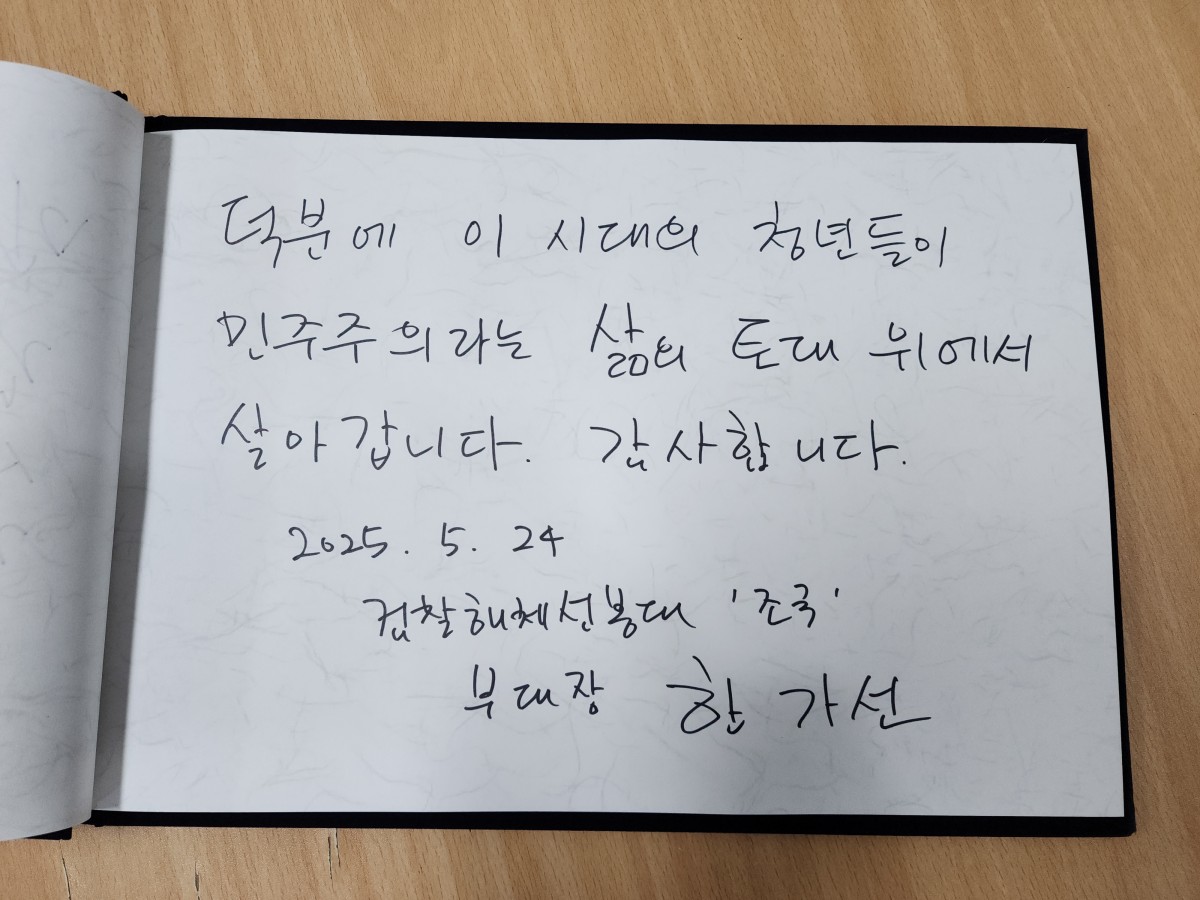 참배 후, 황명필 최고위원, 최종열 부산시당위원장 권한대행, 검찰해체선봉대 '조국' 이규원 선봉대장, 한가선 부대장은 방명록을 남겼습니다.